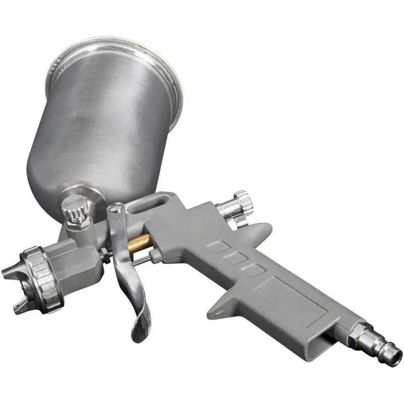 Malersprøjten er en aluminium sprøjte med 600 mm beholder til maling og rustfrit stål dyse. Den har ventiler til justering af luft og farve.