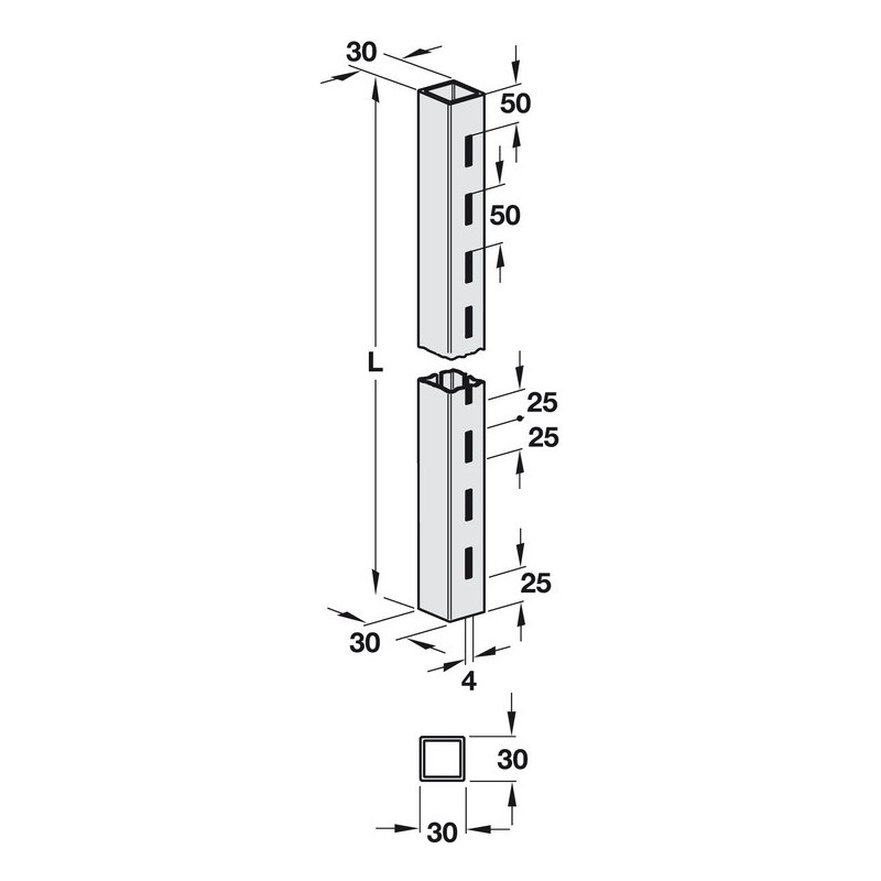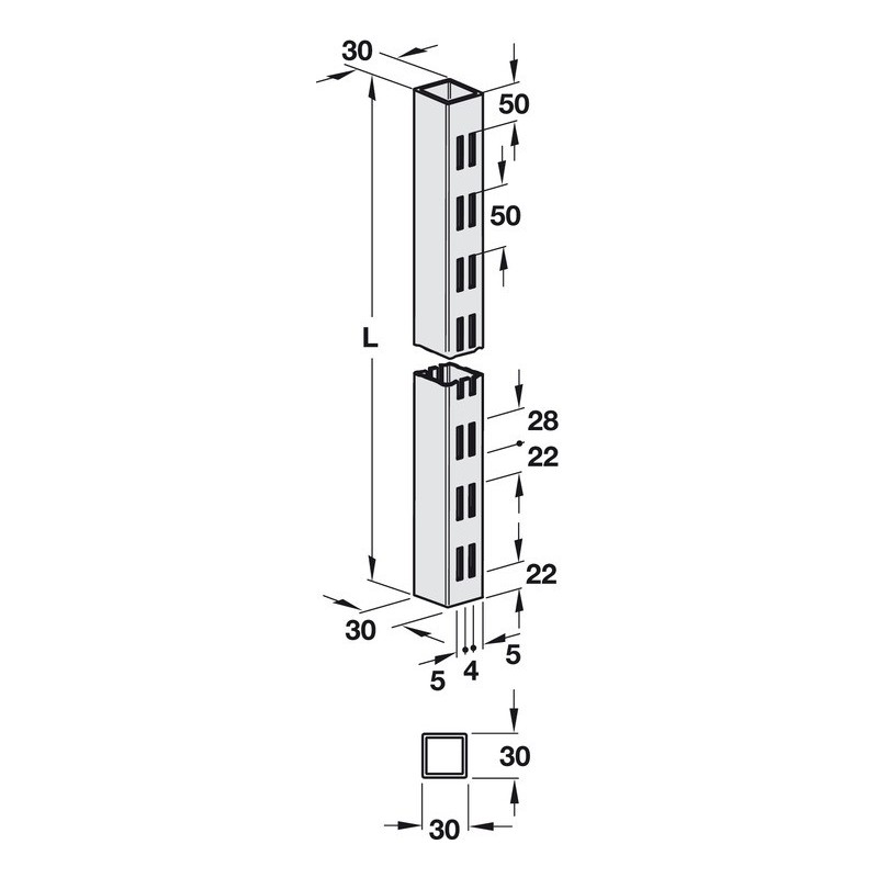 Søjlen fås med hulller i 1 række på 2 sider, huller i 1 række på alle 4 sider eller huller i 2 rækker på 2 sider. Søjlen har en hulrække på 50 mm.
