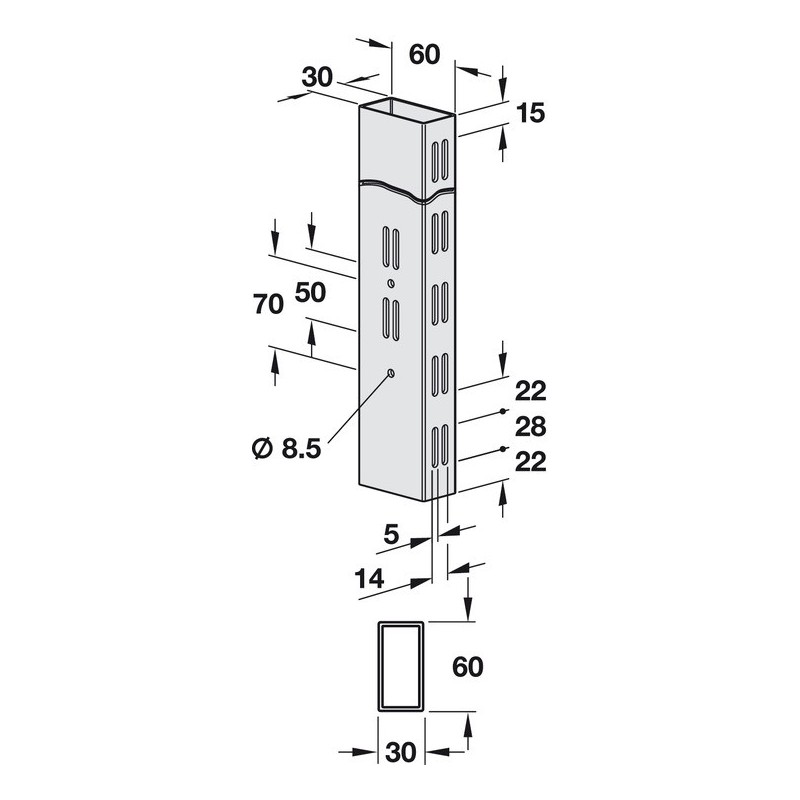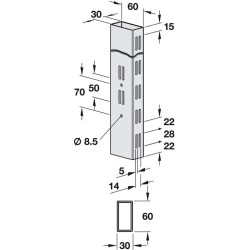 Rektangulær søjle 60 x 30 mm til vores smarte byg-selv-reolsystem. Skinnen er produceret i stål og har en pulverlakeret sort overflade.