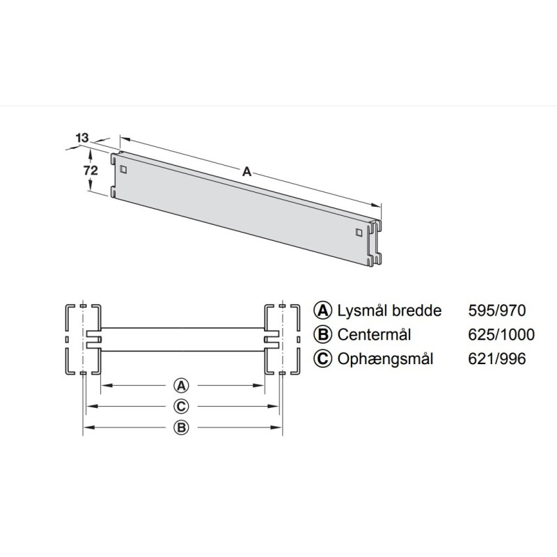 | Model | Lysmål bredde A mm | Centermål B mm | Ophængsmål C mm |