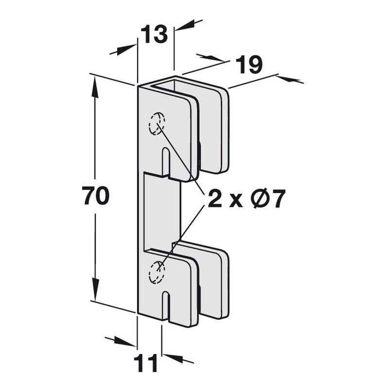 Bagvægsholder til ophængning på siden af søjle med huller i 2 rækker. Denne model skrues fast i siden af bagpladen (minimumstykkelse 19 mm) og hængtes fast mellem 2 søjler.