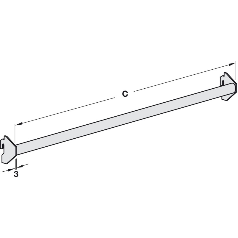 Bøjlestang til vores smarte byg-selv-reolsystem. Denne model kommer med 1 ophængskrog i hver side og kan hægtes direkte fast mellem 2 skinner eller søjler.