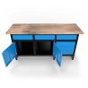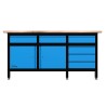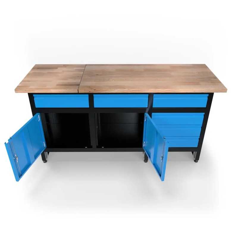 Denne XL arbejdsbænk har masser af opbevaringsplads - 6 skuffer og 2 kabinetter. Det hele bevaret i en ramme af holdbart stål med en topplade af gummitræ.