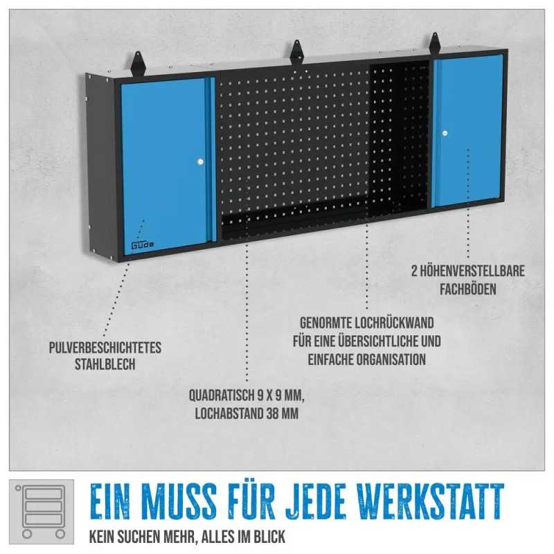 Sæt med kvalitets udstyr til værkstedet. Indeholder 3 dele: arbejdsbord, hultave og skab til ophæng på væg.
