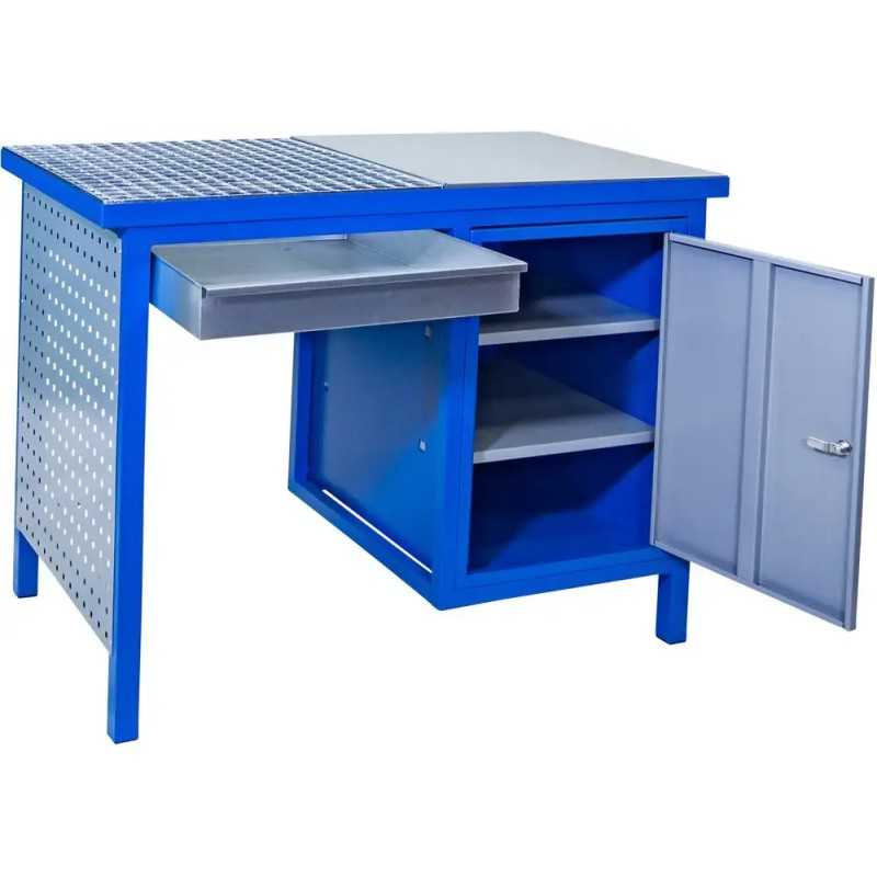 Arbejdsbænken har et sikret kabinet med lås, hvori du finder 2 udtagelige/flytbare hylder.