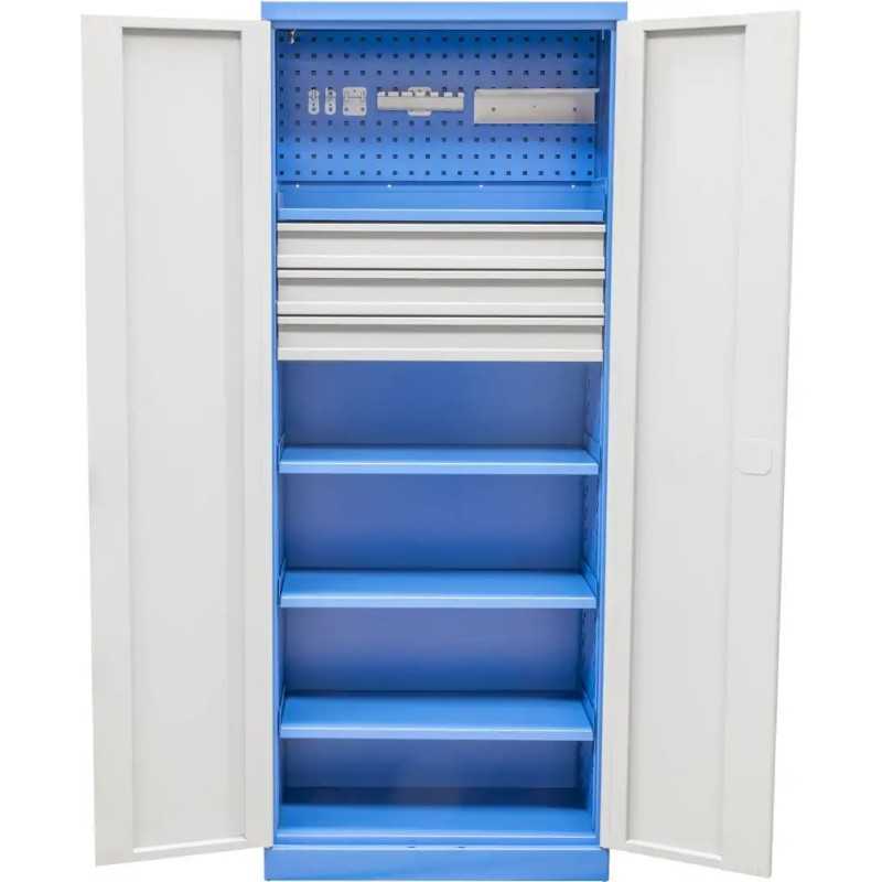Denne model har opbevaringsmuligheder i form af hylder, skuffer og en indbygget hultavle. Skabet er det rette valg til dig som ønsker fuld styre over hvordan dit værktøj m.m. bliver opbevaret. Hylderne kan flyttes efter behov.